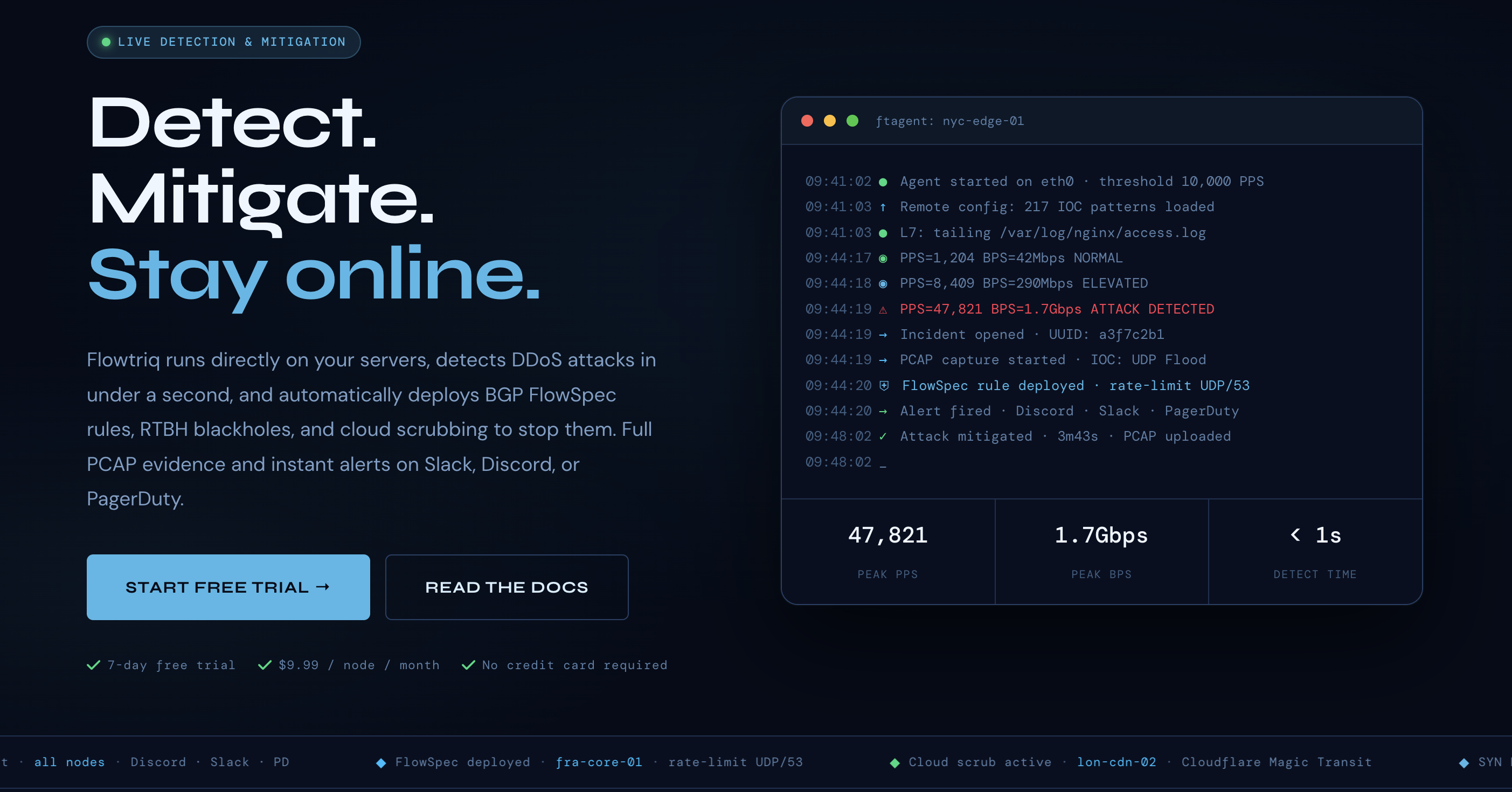 Flowtriq is a lightweight, agent-based DDoS detection and auto-mitigation platform designed to kill this scenario before you even wake up. Built on a philosophy of "install and forget," it utilizes a Python-based agent (ftagent) that sits directly on your Linux nodes. Unlike legacy hardware appliances that cost a kidney, Flowtriq focuses on sub-second packet-level inspection and automated BGP FlowSpec orchestration. It’s built for the bootstrapper who needs enterprise-grade shielding without the enterprise-grade complexity.