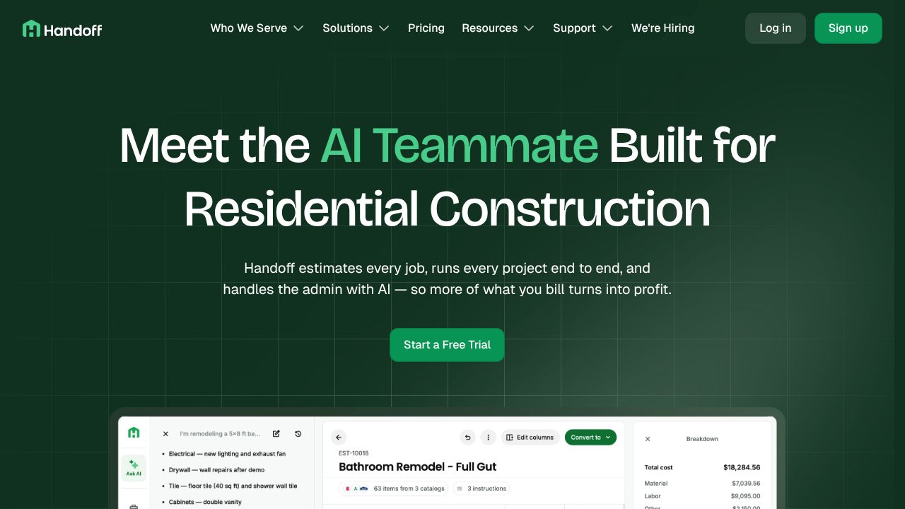 You know the drill—mud on your boots, client breathing down your neck, and you’re juggling a voice memo, a half-baked spreadsheet, and three browser tabs for lumber prices that changed—again. Estimates slip, proposals lag, and revenue leaks out of the bucket you just patched. Handoff.AI tackles that chaos head-on: an AI-driven, construction-specific stack that goes from raw input (text, PDFs, or voice notes) to scoped estimates, proposals, CRM records, invoicing, and even financing—without duct-taping five apps together.